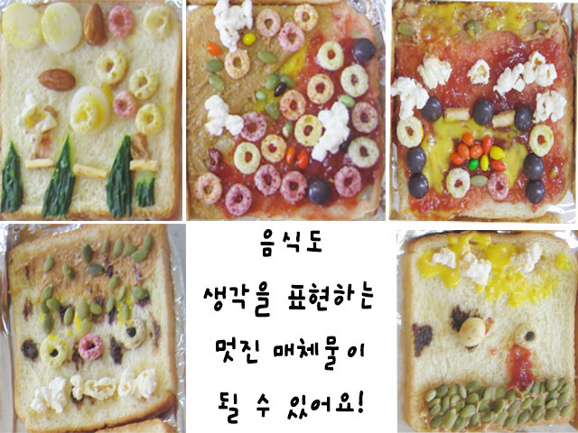 토스트위에 풍경화를 그리기 위해 다양한 재료로 생각을 표현해 봅니다. 팝콘은 구름으로, 후르츠 링 씨리얼은 예쁜 꽃과 해로 변신하고, 오이는 멋진 나무가 되었습니다. 토스트 풍경화를 만드는 동안 토스트 위에 숨겨진 이야기를 친구와 나누기도 합니다. 이번 주말에는 온 가족이 함께 모여 토스트 풍경화를 만들어 보세요. 그리고 그림 이야기를 서로 들려주세요. 요리재미 속에서 창의성이 쑥쑥 자랄겁니다.
