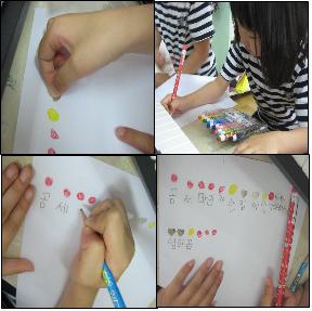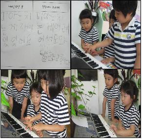 다음 놀이 시간에는 어떤 모습이었는지 보이세요? 친구들은 이 과정을 통해 나의 욕구와 그에 따른 책임감을 배워나가는 중이랍니다.피아노에 관심이 많은 하늘반 친구들은 틈만 나면 피아노를 쳐보려고 키보드 앞으로 모이곤합니다. 그런데, 피아노를 잘 치고 싶은데 방법을 잘 모르는 친구들도 있어요. 악보를 보고 치기엔 더더욱 어렵고.. 어떻게 하면 좋을까요? 교사는 의도적으로 피아노 건반에 색깔이 다른 스티커를 붙여 놓았어요. 그리고 하늘반 친구들을 들여다보았지요.유아1: <♪곰세마리를 치며>너 피아노 칠줄 몰라? 유아2: 응 유아1: 그럼, 내가 가르쳐 줄까? 어떻게 가르쳐 주지? 교사: 악보를 만들어 주면 어떨까? 유아3: 으악~ 난 악보볼 줄 모르는데.. 아이들은 잠시 고민에 빠져든다. 유아3: 그런데, 오늘보니까 누가 스티커 붙여놨어. 이게 왜 여기있지?..아이들은 스티커를 한참동안 빤히 쳐다보더니 자기들만의 악보 만들기를 시도해본다.
