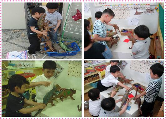 그리고 꽃잎반에 큰 모형 공룡이 생겼어요! 공룡모형을 통한 놀이는 어떻게 진행될까요?