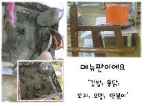 유아들은 자신들이 만들 음식이 어떻게 해야 만들어진다는 것을 서로 이야기합니다. 그리고 만들어진 음식을 친구들과 나누면서 함께 즐거움도 나누고 있습니다.