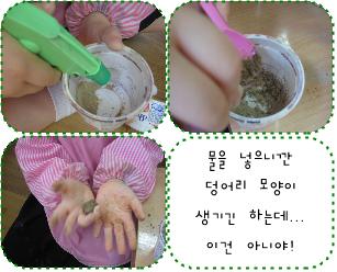 <가설 2>를 검증하기 위해 가루와 물을 준비하는 친구들의 얼굴엔 기대가 가득합니다. 먼저 가루에 물을 넣어 숟가락으로 저어 섞습니다. 잠시 후 숟가락으로 젓는 방법이 맘에 들지 않는 듯, 손바닥 위에 올려 놓고 뭉치기 시작합니다. 유아 : 잘 안 된다. 유아1: 야! 갈라진다. 물을 좀 더 넣어라. 찰흙 덩어리를 만들면서 <잘 뭉쳐지지 않고 갈라질 땐 물을, 덩어리가 찐득찐득하여 손에 달라붙을 땐 가루>를 더 넣습니다. 유아 : 찰흙 덩어리로 작품을 만들고 그게 굳어서 가루를 만들었는데, 가루로 덩어리를 만드는 건 왜 잘 안 되지? <가루와 물을 섞기만 하면 말랑말랑한 덩어리가 될 것>이라 기대했던 친구들. 하지만 도예 선생님께서 만들어 주신 찰흙 덩어리처럼 되지 않는대요. 무슨 특별한 방법이 있는 것일까요? 그리고 도예 선생님께서 준비해 주시는 찰흙 덩어리는 어떻게 만든 것일까요?