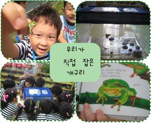 지난 주 방짜유기 박물관 잔디밭에서 잡아온 개구리. <우리가 직접 잡은 개구리>이기 때문일까요? 누가 시키지도 않았는데 매일 아침 등원하면 개구리의 상태부터 확인을 하고, 개구리가 볼 수 있도록 책도 보여주며, 개구리가 들을 수 있게 “개굴개굴 개구리”노래도 불러줍니다. 그런데 개구리가 이슬반에 온지 7일째 되는 오늘. 유아 : 선생님, 개구리가 없어요. 안 보여요. 유아1: 선생님이 어제 집에 갈 때 개구리가 있었어요? 교사 : 응. 어제 분명히 있는 걸 확인을 하고 갔는데...참 이상한 일입니다. 개구리는 하루 사이에 어디로 사라진 것일까요?#벽지로 해요!