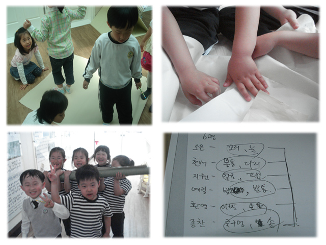 T: 왜? 유아4: 앞면은 지저분해요. 전지에 그리기 전 역할을 다시 정하고 자료들을 보며 그리기 연습을 합니다.