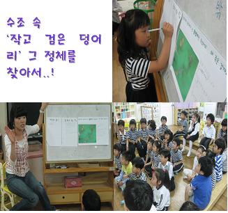 유아들의 생각에 따라 수조속에 있는 올챙이 똥과 처음에 따로 빼놓았던<작고 검은 덩어리>를 비교해 봅니다.