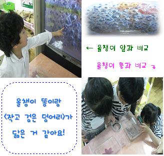 대부분의 유아는 오랜시간 관찰하고 탐색하는 과정을 통해<작고 검은 덩어리>가 똥이라는 결론을 내렸지만 소수의 유아들은 아직도 <알>이라는 생각을 가지고 있었습니다. 그래서 <개구리 알> 사진과 <작고 검은 덩어리>를 비교하며 관찰해 보기로 합니다.