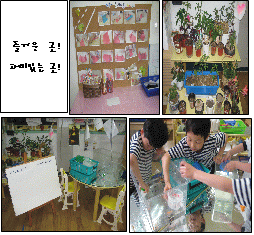 빛이 나아가는 무수한 방향만큼 다양한 생각들이 끝없이 뻗어 나아가고 있는 하늘반 친구들에게 하늘반의 두 교사는 교실이란 공간속에서 교육적인 요소들을 제공하기 위해 환경의 변화를 이끌어 냈어요.우리 아이들의 글쓰기와 글자의 대한 흥미를 유발하기 위해 편지함 옆에 작은 글쓰기영역을 준비하였구요. 또, 교실의 영역속에 식물을 배치하여 놀이의 일부처럼 늘 가까이에서 즐겁게 식물을 돌볼 수 있도록 식물영역을 만들어 보았어요.