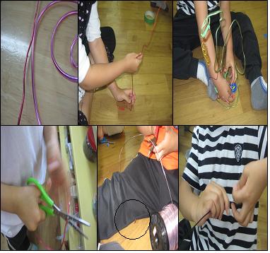 고민하던 친구들은 가장 쉽게 테이프를 가져와서 붙여봅니다. 교사는 친구들 곁에서 철사를 돌려가며 철사와 철사를 잇는 것을 보여주기도 하고, 함께 작은 손에 힘을 주고 감아보기도 합니다. 긴 철사가 옆에 있는 친구를 찌르지 않을까 걱정하며 다리 밑에 철사 끝을 넣어서 활동하는 모습을 보며 기특한 생각도 듭니다.