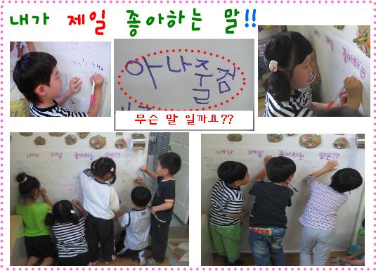 - 내가 가장 좋아하는 말이라는 노래를 배워보며 아이들이 가장 좋아하는 말을 교실의 공간을 이용하여 적어 보기로 했답니다. 교사: 교실 어디가 좋을까? - 아이들은 화장실 옆쪽의 공간이 적당하다고 합니다. 유아: 화장실에 갈 때 마다 보면 기분이 좋잖아요. 유아1: 물 마실 때도 볼 수 있고 적을 수도 있잖아요. 내가 좋아하는 말들로 꾸며진 공간에는 어떤 말들이 적혀 있을까요?