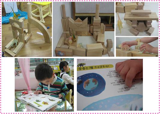 - 쌓기 영역에서 블럭으로 공룡이 사는 집을 만들고 공룡에 대한 책에도 관심을 보이고 있는 아이들.. 가지고 온 공룡책을 교사에게 보여 주며 공룡이 왜 사라졌는지 이야기 합니다.다른 친구들도 공룡에 대해 관심을 보이며 공룡이 사라진 이유에 대해 이야기를 나누어 봅니다.