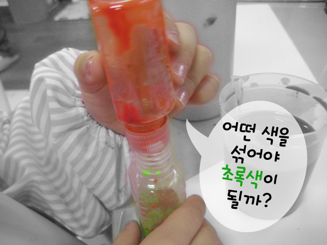 “우리가 새싹반이니깐 초록색이잖아요. 그런데 교실에는 초록색이 많이 없어요.” “초록색 물감으로 초록색 그림을 그려도 되겠어요.” “그런데 지난번에 우리가 초록색 물감을 다 써버려서 하나도 없는데 어떻게 하지?”“그러면 초록색 물감을 만들면 되잖아.” “물감을 섞어서 새싹반의 초록색을 만들어 보면 재미있겠다.”