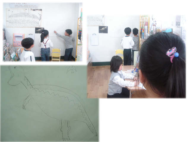 그래서 뒤집어서 다시 그립니다. T: 앉아서 보니까 너희들이 그린 게 작은지 큰지 모르겠어. 그림은 앉아서 그리고 확인하는 것은 일어서서 하는 게 어떨까? 바닥보다는 벽이 훨씬 멀리 볼 수 있어서 바닥에 그리던 그림을 붙이고 그립니다. T: 얼굴을 그렸는데 멀리서 보니까 어떠니? 유아들: 작게 그린 것 같아요. T: 그러면 다시 그려보자. 몇몇의 친구들은 괜찮다고 하지만 멀리서 확인한 친구가 마음에 들지 않다고 합니다. 유아2: 얼굴 밑이 더 길어서 이상해요. 그 그림을 그리던 친구는 다시 그립니다. 어느 다리가 진짜인지 구분할 수 없게 종이에는 점점 연필자국이 많이 남았습니다. 이렇게 많은 수정을 하여 그린 그림은 또 하나의 티라노 사우르스가 되었습니다. 앞으로 어떤 방향으로 나아가게 될까요?