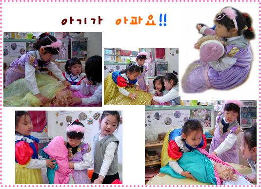 - 여자 친구들의 병원놀이! 아기의 열을 낮추기 위해 이불도 덮어주고 안아서 달래주며 어쩔 줄 몰라 하는 아이들! 비록 가상놀이지만 엄마인 유아는 제법 진지하게 행동하고 걱정스런 눈으로 바라보며 아픈 아이의 열을 낮추기 위해 여러 가지 노력을 하였답니다. 아기의 열을 낮추기 위한 아이들의 놀이가 궁금해 집니다.