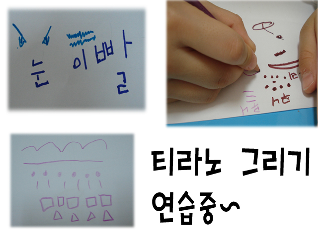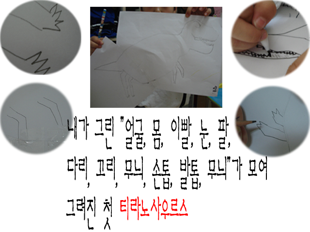 그 다음 다리를 그립니다. 교사: 그런데 다리를 그려야하는데 자리가 없네. 어떻게 할까? 유아: 나중에 붙이면 되잖아요. 유아들: 합체하자. 다리를 그릴려면 이렇게(종이를 하나 더해서 가까이 가져가 다리를 그리는 것)해야된다. 종이를 이리 저리 놓아보면서 위치를 정한다. 한 친구는 테이프로 두 종이를 붙인다. 유아1:몸이 뚱뚱한 것 같아요. 유아4:진짜 티라노는 뚱뚱하다. 교사:어디가 잘못된 것 같아? 유아1:다 잘못된 것 같아요. 다리가 너무 짧아요. 각자가 생각한 티라노의 모습을 주고 받으면서 하나의 티라노를 완성시킵니다. 그림을 보고 앉아 있는 모습이 하늘을 나는 익룡을 잡아 먹으려는 모습 같다고 하네요. 우리의 첫 티라노사우르스. 얼마나 더 많은 연습을 해야 멋진 티라노사우르스가 될까요?