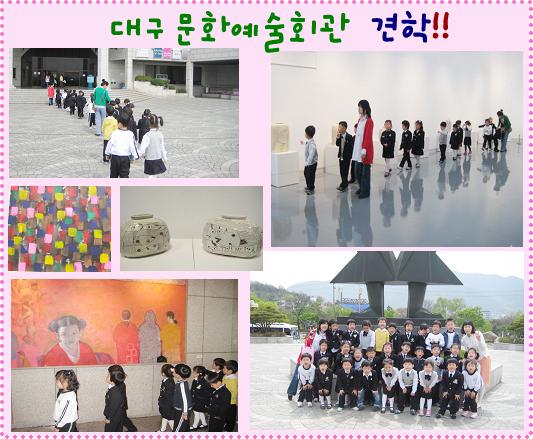- 꽃잎반 아이들과 함께 다녀 온 대구문화예술회관! 전시관 입구부터 펼쳐진 커다란 그림들. 전시관 마다 다양한 종류의 나무. 흙으로 만든 작품들을 바라보는 아이들의 모습이 사뭇 진지했답니다. 어떻게 만들었을까? 하는 호기심과 궁금증을 친구들과 이야기 나누며 관람하는 아이들..