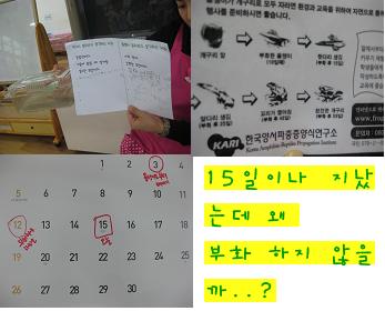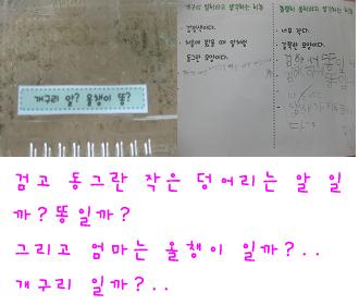 수조 속 <작고 검은 덩어리>에 대한 유아들의 생각은 어떻게 변화 되고 있을까요? 유아1: 까만 것이 안에 있고 투명한 것이 밖에 있어서 알인 것 같아요. 유아2:처음 우리반에 왔던 개구리 알처럼 동그랗고 까매서 저것도 알 같아요. 유아3: 너무 작고 길쭉해서 똥 같아요. 유아4: 냄새가 지독한걸 보니 똥 같아요. 유아5: 개구리 알도 있고 똥도 들어 있는 것 아니에요? 교사: 그럼 이것은 어떻게 할까요? 유아들: 버리지 말고 그냥 둬요. 안에 알이 있을지도 모르잖아요. 교사: 그럼 알이 부화될 때 까지 얼마나 더 기다려야 할까? 유아6: 저기 10일이 지나면 부화한다고 적혀 있어요. 개구리 알에 대한 설명서에 <10일이 지나면 부화한다>고 적힌 것을 확인하고 유아들과 다시 이야기를 나눕니다.유아7: 개구리 알을 둔지 10일이 훨씬 넘은 것 같은데? 유아8: 조금 더 기다려 봐요. 엄마가 곁에 없어서 안 태어나는게 아닐까요?
