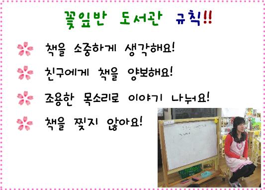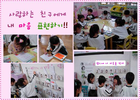- 마음을 표현하는 다양한 방법들 중 편지로 마음을 표현하기로 결정한 아이들.. 사랑하는 친구를 생각하며 편지로 마음을 전해 보았답니다. 다양한 방법으로 마음을 표현하는 꽃잎반 다음 이야기 기대해 주세요!!<도서관에서 지켜야 할 규칙>