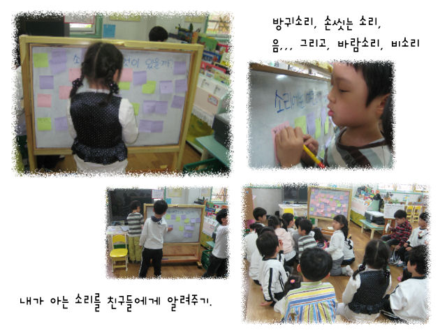 “귀로 들리는 것이 소리야” 소리에 대한 정의를 내리고 난 후 그동안 친구들이 이야기한 소리를 적어보기로 했어요.