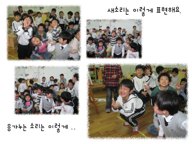 여러 가지 소리들은 어떤 모습으로 표현할 수 있을까요? 햇살반 친구들은 여러 가지 소리를 몸으로 표현해 보기로 했어요. 새소리를 표현 할 때는 “짹짹”소리를 내면서 두 손으로 새부리 모양을 만들어요. 바람소리를 표현할 때는 두 손을 하늘로 향하게 한 후 좌우로 흔들어요. 졸졸 흐르는 물소리는 어떻게 표현 하는 게 좋을까요? 두 손으로 물줄기를 만들고, 몸은 알파벳 S모양으로 이리저리 흔들어주어요. 마지막으로 햇살반 친구들이 가장 재미있어하는 응가소리는 어떻게 표현할까요? 두 손은 주먹을 불끈 쥐고, 쪼그려 앉아서 윽~하고 힘을 줘요.햇살반 교실에는 또 어떤 소리들이 숨어 있을까요? 햇살반 소리를 찾아보기 위해 녹음기와 마이크를 준비합니다.