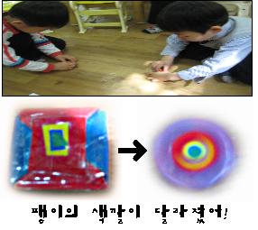 유아1: 우와! 너 팽이는 돌리니까 무지개 색 같다.