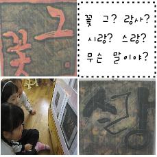 대구문화예술회관을 다녀오고 난 후, 그 곳에서 본 작품들을 사진을 통해 한번 더 보았습니다. 유아1: 그 꽃? 꽃 그? 어떻게 읽어야 돼? 유아2: ‘그 꽃’이 말이 되지 않나? 유아3: 책 읽는대로 읽으면 ‘꽃 그’ 아니에요? 교사 : 선생님이 생각하기에 옛날 책이나 글자를 보면 오른쪽에서 왼쪽으로 읽는 글도 있었던 것 같은데, 그런 책을 한번 찾아볼까?