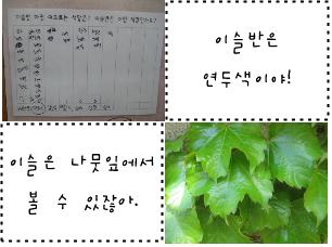 요즘 미술 영역에서는 여러 가지 물감 색 만들기가 이루어지고 있습니다. 이에 교사는 이슬반을 나타낼 수 있는(이슬반 하면 떠오르는) 색을 이야기 나누어보기로 합니다. 유아: 이슬 색깔이 하늘색인 것 같애. 그래서 이슬반이 하늘색이었으면 좋겠어. 유아1: 나는 연두색이었으면 좋겠어. 이슬은 나뭇잎에 달려있잖아. 유아2: 나는 빨간색이면 좋겠다. 이슬반에는 아침에 햇빛이 많이 들어오잖아. 햇빛은 빨간색이거든. 유아3: 나는 흰색이었으면 좋겠어. 이슬은 사실 흰색이야. 이슬반을 나타낼 수 있는 다양한 색과 그 이유를 설명하는 아이들. 그 의견들 중에서 연두색(손을 많이 든)이 결정되고 우리 유치원과 교실, 우리 집에서 초록색과 연두색을 찾아보기로 합니다. #똑같은 이름을 가진 티라노의 다른 점