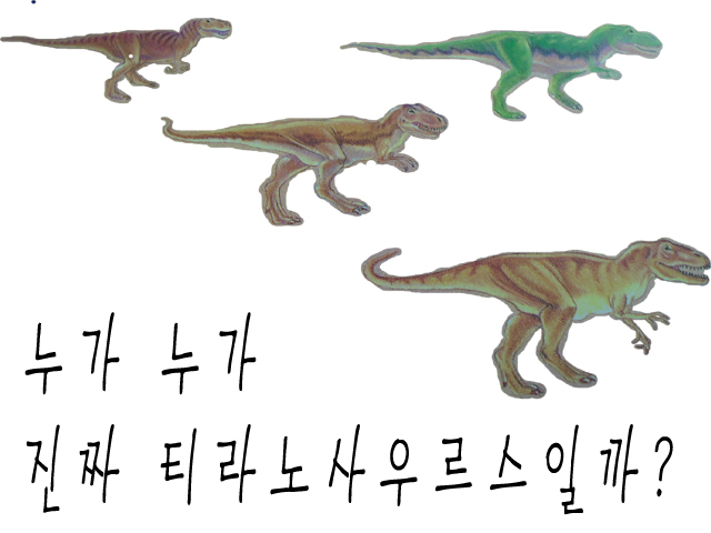 모든 티라노사우르스가 같은 줄로만 알았지만 다른 점들도 발견하게 됩니다.유아:이거는 다 달라요.(등과 배를 가리키며) 교사:한 색깔이 아니란 말이야?(다른 책을 보며)애들도 다르네? 등은 진한 것 같은데 배는 연한 것 같은데?선생님이 보여준 사진도 그럴까?유아: 어!?달라요!교사:그러면 색칠한 것들은 잘못 색칠한거네? 유아:네. 물감으로 다시 칠하면 되요.유아1:우리집 장난감 공룡은 초록색이예요. 다른 책에 나오는 티라노를 보며 말합니다.유아:여기는 초록색, 여기는 검정색, 여기는 파란색, 여기는 하얀색.교사: 너는 무슨 색이라고 생각하니?유아1:갈색, 초록색, 빨주노. 교사:그런데 티라노사우르스랑 티라노사우르스 렉스랑은 뭐가 다른걸까?유아1:이름이 다른거죠. 교사:그냥 이름만 다른거니? 유아1:색깔도 달라요. 교사:그럼 애는 티라노사우르스야? 티라노사우르스 렉스야? 유아1:그 것 두 개는 똑같아요. 이름만 다른거예요. 교사:어떻게 알았니? 유아1:한반도의 공룡 봤는데 다 틀리더라구요. 교사: 뭐가 다 틀리다는 거니? 유아1: 색깔이요. 교사:선생님은 티라노사우르스랑 티라노사우르스 렉스랑 어떻게 다른건지 물어본거야. 유아2:티라노사우르스랑 티라노사우르스 렉스랑 똑같은 것 같아요. 좀 다른 것 같지만...교사:어!? 표지에는 티라노사우르스라고 되어있고 글에는 티라노사우르스 렉스라고 되어있어! 그 공룡에게 난폭한 도마뱀의 왕이라는 뜻으로 티라노사우르스 렉스라는 이름을 붙여줬다고 되어있네. 다른 점 투성이의 티라노사우르스. 모든 티라노사우르스는 정말 다른 걸까요?
