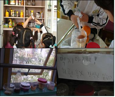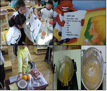 하늘반 친구들의 호기심이 또 발동했어요. 한 친구가 가져온 <곰팡이 미스터리>책을 보고 나서 곰팡이에 대해 알고 싶은 것들이 많아졌어요.그 책에는 우리가 곰팡이 실험을 했을 때 보지 못한 아주 많은 곰팡이들이 소개되어 있을 뿐 아니라, 그 곰팡이를 만드는 방법까지 소개가 되어있었죠. 유아1: 우와~ 저렇게 많은 곰팡이가 있다니..우리도 주인공처럼 실험해봐요.유아2: 그래서 저런 곰팡이가 안 생기면, 책 지은 사람한테 전화해서 따져요. 우리의 실험은 또 이렇게 시작되었고, 다음날 책에서 소개한 실험재료들을 집에서 가져왔어요.딸기, 오렌지, 커피, 컵케잌, 방부제를 넣지 않은 식빵 그리고 스파게티까지! 그런데, 스파게티는 스파게티 면 밖에 준비가 되어 있지 않아요.우리는 스파게티를 준비하기 위해 쿠킹실로 이동했어요.너무 들뜨고 설레는 마음으로 요리를 시작했죠~먼저 스파게티를 꺼내고 필요한 도구를 준비했어요.끓는 물에 스파게티를 넣고.. 유아1: 국자로 뜰까? 유아2:아니! 거름망이 있는 것을 떠야해 유아3: 집게로 뜰까? 유아4: 그걸로 다뜨면 힘들껄 유아4: 아하~ 그물이 있는 채에 물을 부으면 돼! 사용하기가 조금 더 편리한 도구를 찾는 사이에 면은 삶아졌어요. 유아1: 스파게티소스를 뿌리고 설탕을 뿌려야 할까? 그냥 삶은 스파게티에 설탕만 뿌리면 안될까?책을 보며 다시 확인을 하던 아이들은 소스그림이 없음을 확인하고 설탕만 넣어요.준비한 재료들은 모두 투명한 용기에 넣고 뚜껑을 닫으려고 하는 순간!유아2: 참! 습기가 있어야 하니까 물을 넣어야해!이렇게 습기를 만들어 준 다음에야 실험준비과정을 마칠 수 있었습니다. 책에서 본 것처럼, 여러가지 색의 곰팡이들을 만날 수 있을까요?