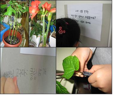 아침이면 식물 친구가 어떻게 변했나 살펴보기를 시작합니다. 아무것도 보이지 않았던 화분에서 작은 싹이 보이더니 어느새 키가 훌쩍 자란 친구도 있고, 작은 봉오리만 보이더니 키가 쑥~ 자라서 예쁜 꽃을 피운 친구도 있어요. 교사는 식물 친구를 통해 아이들이 <과학, 수 활동>과 연관된 활동의 전개를 마음에 두고 식물친구들 한 켠에 <클립과 건전지>를 가져다 놓았어요. 식물이 놓인 뒤쪽 벽에는 <식물 친구 키가 얼마나 자랐을까요?>라는 코너를 만들어서 관심을 유도해 봅니다. <선생님 고구마 클립 15개>를 발견한 아이들은 너도 나도 식물 친구 키재기를 시도합니다. 클립과 건전지로 식물 키를 재는 것이 쉬운 일일까요?
