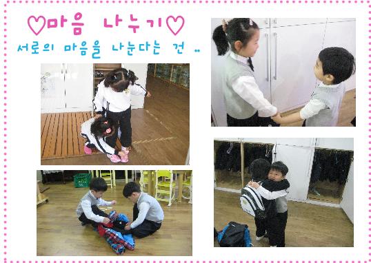 -마음을 나누는 것이란 먹을 것을 함께 나누는 것. 내가 웃으면 나를 보고 웃는 것.상대방이 기쁘면 나도 같이 기쁘고 상대방이 슬프면 나도 같이 슬퍼지는 것입니다. 꽃잎반 친구들과 마음 나누기를 하면서 아이들 스스로 그 속에서 양보와 배려. 이해와 사랑하는 마음을 엿볼 수 있었답니다. 아직 까진 서툴고 부끄럽지만 서로에게 아름다운 손을 먼저 내밀고 그 손을 마주 잡고 마음을 나누며 쑥쑥 성장할 아이들의 모습을 상상하며 천천히 기다려 봅니다.