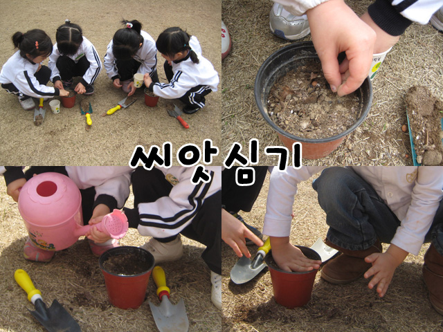 식목일을 맞이하여 새싹반 아이들과 함께 꽃씨 심기를 하기로 하였답니다. T: 4월5일은 무슨 날일까? C:식목일이에요. T:식목일 날에는 나무와 꽃을 심는 날 인데 우리들이 오늘 미리 꽃씨를 같이 심어 볼꺼예요. 선생님과 함께 꽃씨 심는 방법을 이야기 나누고 유치원 마당으로 향해 내가 심고 싶은 씨앗을 골라 흙속에 넣고 토닥토닥 흙도 두들겨 주고 난 다음 물도 꼭꼭 주었답니다. “나는 해바라기 심었는데, 빨리 자랐으면 좋겠다.” “우리는 풍선 초 심었어.” "어떤 꽃이 필지 궁금해." “새싹이 빨리 났으면 좋겠어.” 아이들의 순수한 소망을 담아서 소중하게 심은 씨앗이 언제쯤이면 새싹반처럼 새싹이 돋아날까요? 꽃이 피어날 때까지 기대해 주세요.^^