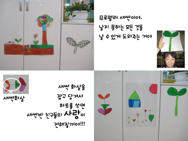 왼) 하트가 있어서 사랑인 것 같아. 아니 저거는 하트 화살이야. <줄기가 화살대, 새싹이 화살, 하트는 사랑을 담은 것>새싹반이 사랑을 전한다는 거야!