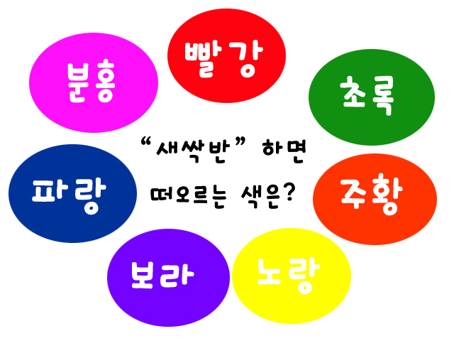 <새싹반 하면 생각나는 것>에 대하여 이야기 나누던 중 우리 반의 색깔에 대한 이야기가 나오게 되었어요. T: 색깔이 뭘까? C: 빨주노초파남보 색깔 같아요. T: 색깔이란 우리 눈에 보이는 여러 가지의 모든 빛을 말하는 거예요. 그럼 우리 반을 생각하면 어떤 색깔이 떠오르니? “나는 새싹반 하면 초록색이 떠올라. 왜냐하면 새싹은 초록색이잖아.” "나는 파란색." “나는 연두색.” “나는 분홍색이 예쁠 것 같아. 선생님 머리핀도 분홍색이고 우리 엄마도 분홍색을 좋아해.” “나는 무지개 색깔.” “핑크색이 점점 진해지면 분홍색이 되요.”T: 다들 좋아하는 색이 다른데 어떻게 정하면 좋을까? C: 무지개 색으로 해요. 새싹반을 생각하면 떠오르는 다양한 색 중에서 아이들은 어떤 색을 선택하게 될까요?