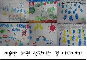 유아1: 나무가 생각나. 나무에 이슬이 맺히니깐. 유아2: 매미가 생각나. 신발장에 보니깐 작년 형님들이 매미는 이슬을 먹고 산다고 적었더라고. 유아3: 물이 떠오르는데? 물이랑 이슬이랑 비슷하잖아. 유아4: 선생님이랑 이슬반 친구들이 생각난다. 교사 : 그런데 선생님이 이슬반 친구들 얼굴을 어떻게 다 그려주지? 유아4: 우리가 그리면 되죠. 유아5: 나는 연필로 그릴래. 유아6: 사진 붙일까? 유아7: 아! 난 매체물로 꾸밀래. 흰 벽을 채우기 위해 이슬반 친구들의 얼굴과 선생님의 얼굴을 표현하기로 합니다.(손을 드는 투표에 의해 결정됨) 그런데 어떤 재료와 방법으로 표현되어질까요?# 살아있는 꽃은 매체물로 사용할 수 있을까?