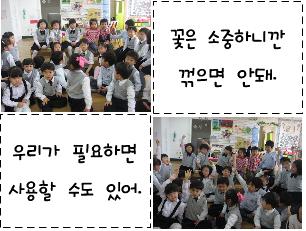 꽃을 이용해서 개미집을 만든 사진을 보며 이야기를 나눕니다. 유아1: 꽃으로 꾸미니깐 예쁘다. 유아2: 근데 저거 꽃 꺾어서 만들었다. 유아3: 꽃 꺾으면 꽃이 아프잖아. 네가 만약에 꽃이라면 얼마나 아프겠냐? 유아4: 꽃은 꺾어서 보면 처음엔 예쁜데, 금방 시들어 버려. 유아5: 생명은 모두다 똑같이 소중한거야. 그러니깐 소중히 아껴야 돼. 유아6: 그런데 꽃을 꺾어서 없어지면 나중에 씨앗을 심으면 되잖아. 그러면 다시 자라잖아. 그러니깐 우리가 필요할 땐 써도 되지.