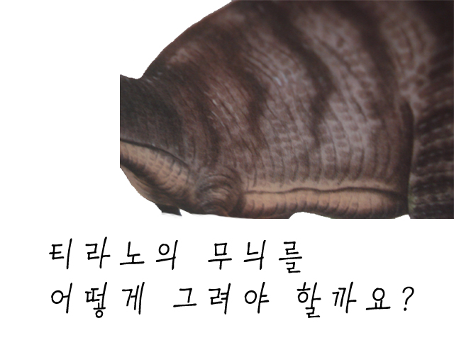 연하게 칠한 것은 울퉁불퉁해 보이지 않아 하고 그 말에 돋보기를 가져와 살펴보며 손으로 크로키 북 종이를 만지고 촉감에 대해 이야기를 합니다. 교사: 줄무늬 있는 부분과 없는 부분 중에 부드러운 부분은 어디예요? 유아2: 줄무늬요. 유아3: 돋보기로 보니까 (줄무늬가 없는)여기가 더 까칠까칠한데요? 교사: 그럼 어떤 쪽에 그려야 더 티라노사우르스 같을까? 하며 반대쪽에 티라노를 하나 더 그려 앞과 뒤를 비교합니다. 더욱 알 수 없는 궁금증만 커져가는 티라노사우르스 그리기. 어떤 궁금증들이 더 생겨날까요?