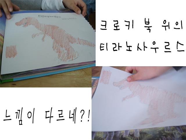한 친구의 크로키 북 위의 그림을 보니 다른 친구들 것과는 다릅니다. 교사: 너가 그린 티라노사우르스는 울퉁불퉁해 보이는데? 유아: 크로키 북에는 원래 울퉁불퉁한게 있어요. 교사: 티라노사우르스를 어떻게 그리면 울퉁불퉁해질까? 유아1: 울퉁불퉁하게 그려요! 이 말을 하고는 티라노 등위에 반달모양으로 울퉁불퉁하게 그립니다. 유아2: 그런데 (등위에)울퉁불퉁한게 아니고 뾰족뾰족한거예요. 교사: 크로키 북에는 맨들맨들한 부분과 울퉁불퉁한 부분이 있는데? 유아3: (색연필로 힘을 주어 색칠하면)세게 하면 울퉁불퉁해져요. 그런데 약하게 하면.. 교사: 약하게 하면 안 울퉁불퉁하다는 거니? 그러면 크로키 북이 울퉁불퉁하니 복사지가 더 울퉁불퉁하니? 유아4: 크로키 북.교사가 크로키 북에(줄무늬가 있는 쪽) 티라노사우르스를 그리던 중, 한 친구가 ‘(색연필로 진하게 색칠)세게 하니까 이렇게 됐어요!’라고 소리칩니다. 교사: 세게 하니 더 울퉁불퉁해 보이니? 유아3: 네.