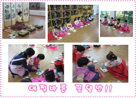 - 기본적인 자세와 어떻게 인사를 해야 하는지 공수법과 멋진 자세를 직접 배우고 친구들과 맛있는 차와 다식을 나누어 먹었답니다. 예절시간을 통해 멋진 모습으로 성장 할 꽃잎반 친구들 기대해주세요.<올챙이다!!>