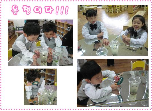 유아7: 점 아니다~ 알이다. 유아8: 선생님 올챙이 다 누워 있어요! 자고 있는거 아니야? - 꽃잎반 친구들은 개구리 알과 올챙이의 생김새와 모양에 대해 이야기를 나누어 보았답니다. 올챙이 알에서 올챙이, 개구리가 성장해 가는 과정을 기대해 봅니다.<분홍방이에요!!>