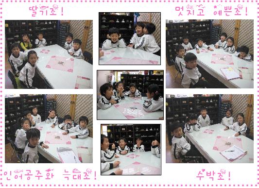 - 아이들과 함께 조별로 이야기 나누기 시간을 가졌답니다. 오늘의 이야기 주제는 우리 조 이름 짓기! 친구들의 다양하고 재미있는 생각들을 나누며 우리 조 만의 멋진 이름을 만들어 보았답니다.