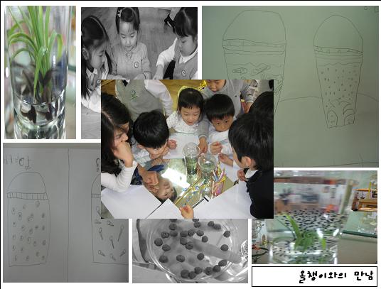 유아3: 물이 더러워져서 올챙이들이 자꾸만 위로 올려 가려고 해요. 유아4: 똥냄새나서 그런가?..유아5: 거품을 먹을려고 올라가나봐요. 유아3: 더러워서 숨쉬기가 힘드니까 위로 올라가요. 유아2: 빨리 물을 갈아줘야해요. 유아1: 그런데, 물을 갈아주다가 올챙이들이 쏙~ 다 빠져버리면 어떡하지? 유아2:아! 파리채같은걸로 막으면 되지.파리채틈이 올챙이보다 작으니까 다 안 빠질꺼야.