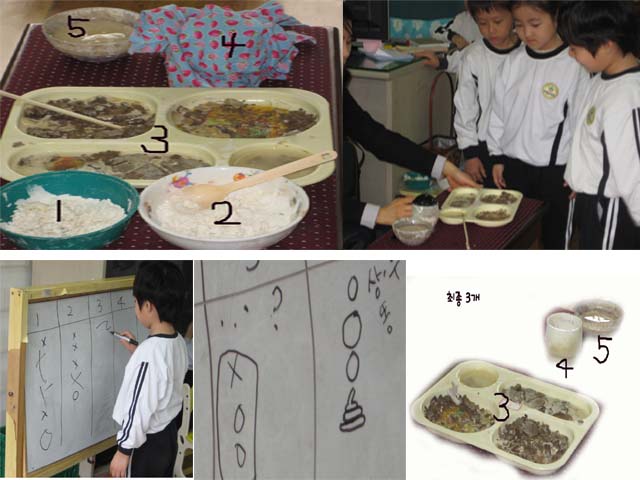 유아3: 내가 만든 반죽에서 냄새 나는데요, 거기에는 밀가루랑 물만 섞었는데~ 유아4: 나는 밀가루, 물, 찰흙 섞었어요. 찰흙 아주 조금. 유아5: 나는 찰흙으로 모양 만들고 거기에 밀가루랑 물 조금만 했는데~