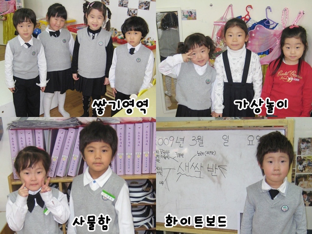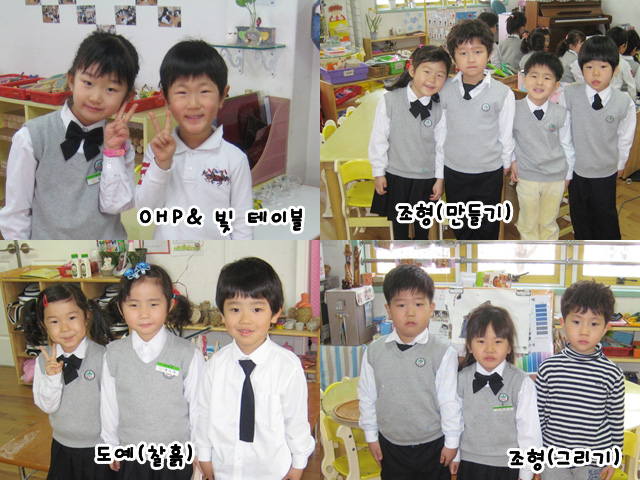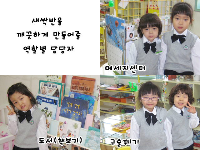 이렇게 하여 각 영역별 <정리정돈 담당자>가 생겨나고 <도서, 역할, 구슬, 쌓기, 편지, 미술, 도예, 만들기, OHP&빛 테이블, 칠판, 사물함>정리 담당자를 정하게 되었답니다. 이제 새싹반 모든 영역에는 정리정돈 담당자들이 놀이가 끝난 후 열심히 정리를 할 거예요. 멋쟁이 새싹반 화이팅♡▣새싹반 하면 생각나는 것들▣