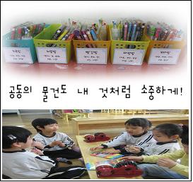 물질적으로 풍족한 환경속에서 살아가는 유아들에게 공동의 물건을 자신의 물건처럼 소중하게 다루는 습관을 가지고 서로 나누어 쓰는 마음을 키워주고자 팀별로 물품을 관리하게 하였습니다. 유아들은 팀별로 나누어준 물품에 팀 이름표를 직접 붙이며 물건에 대한 애착심과 함께 팀에 대한 소속감도 느끼게 되었답니다.유아1: 야~ 보라팀! 뚜껑 챙겨라~유아2: 선생님 12자루 다 정리 했어요!