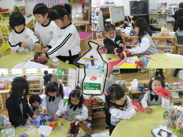 교실에 있는 여러 가지 영역들 중 새싹반 아이들은 만들기 영역에 많은 흥미와 관심을 보입니다. 그래서 만들기에 몰입하며 상상의 나래를 펼치는 아이들의 이야기는 너무나도 흥미롭게 느껴지기도 하지요.
