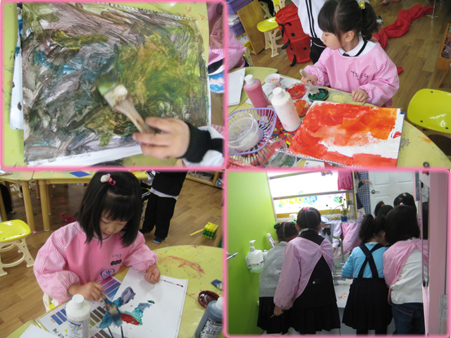 우유 곽을 여러 개 붙여 해적선을 만들기도 하고, 요플레통에 색 색 별의 빨대를 잘게 잘라 넣어 팥빙수를 만들기도 해요. 평소에 익숙히 접해 보았던 요구르트 병, 빨대, 우유곽, 광고지, 조각 천 여러 곡식들과 신기하고 예쁜 꽃잎 모두 흥미로운 만들기를 할 수 있는 재료가 된답니다.내 마음대로 움직이는 붓으로 나는 멋진 화가가 될수 도 있어요. 미술영역에 항상 준비되어 있는 알록 달록한 물감과 다양한 재질의 종이는 아이들의 마음을 사로잡기에 충분합니다. 내가 그린 그림에 또 다른 색을 칠하니 더 신기한 색이 나오기도 하고, 다양한 물감의 색을 섞으니 새로운 색이 만들어 지기도 합니다.