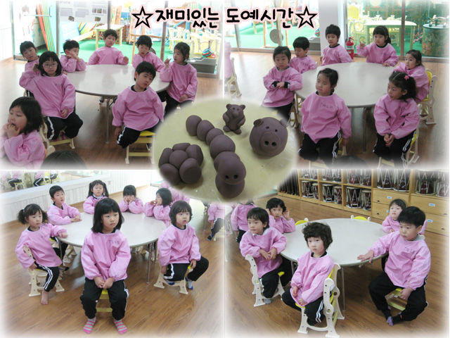 찰흙을 조물 조물 손으로 만져보고 조금씩 떼어내 길쭉 길쭉 만들어보고 또 손바닥 위에 놓고 동글동글 굴렸더니 “구”가 만들어졌어요. 선생님은 여러 개의 구를 이용해 애벌레도 만들고 돼지도 만들고 또 두더지도 만들어서 보여주셨어요. 우리들도 재미있는 찰흙놀이를 하며 신나는 하루를 보냈답니다.