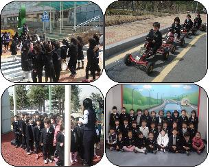 이렇게 8개의 지하차도를 지나 교통 랜드에 도착하였습니다. 도착한 우리는 안내해 주시는 선생님을 따라 실내로 이동합니다. 그리고 자전거 페달을 돌리면서 교통 안전에 대한 문제 풀기, 위험한 행동을 하는 어린이 찾아내기, 자전거와 인라인 스케이트 안전하게 이용하기 등 교통 안전에 대한 내용을 게임으로 이해해 봅니다.실외로 나온 친구들은 선생님과 교통 안전 표지판에 대한 이야기를 나눈 후, 횡단보도, 육교, 기찻길 바르게 건너기를 직접 해 봅니다.
