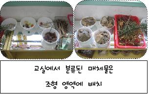 밖에서 찾을 수 있는 매체물을 예상한 뒤 직접 나가봅니다. 유치원 뒤편의 공원에는 우리가 예상한 매체물도 있고 예상하지 못한 매체물도 있습니다.유아 : 선생님 이것(부러진 나뭇가지)도 매체물 맞죠?공원 곳곳을 둘러보며 찾은 매체물을 비닐에 넣어 교실로 돌아옵니다.