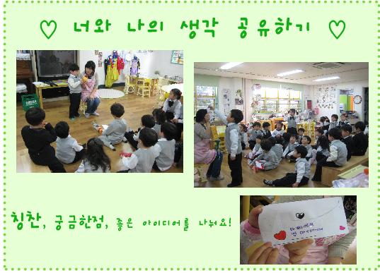 - 너와 나의 생각을 함께 나누는 꽃잎반의 공유 시간!! 친구들과 함께 모여 놀이시간에 만든 멋진 작품을 소개하고 칭찬과 궁금한 점. 그리고 더 좋은 아이디어를 친구들에게 이야기 해주며 생각 더하기 생각은 더 멋진 생각을 만들 수 있음을 경험하였답니다.