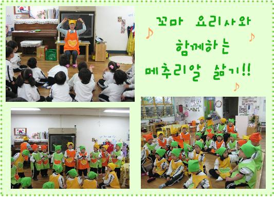 친구들과 함께 모여 요리에 대한 설명과 요리시간에 지켜야 할 규칙에 대해 이야기 나누기 시간을 가져보았답니다. 요리사로 변신하기 위해 앞치마와 머리수건을 쓴 친구들!!